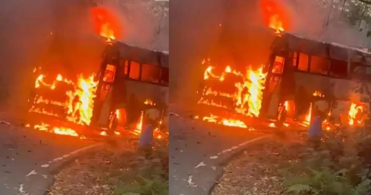 ഇരിട്ടി മാക്കൂട്ടം ചുരത്തിൽ ടൂറിസ്റ്റ് ബസിന് തീപിടിച്ചു; ബസ് പൂർണമായി കത്തിനശിച്ചു