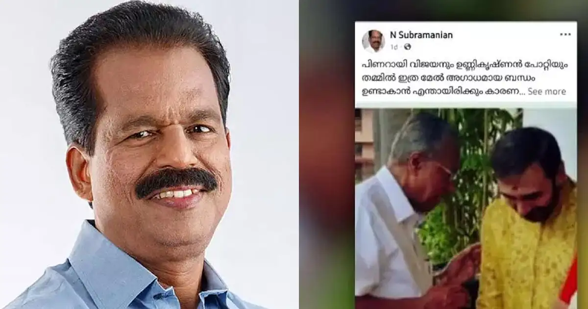 കലാപാഹ്വാനം നടത്തിയെന്ന വകുപ്പ് ചുമത്തിയാണ് കേസെടുത്തിരിക്കുന്നത്. പിണറായി വിജയനും ഉണ്ണികൃഷ്ണൻ പോറ്റിയും തമ്മിൽ ഇത്രമേൽ അഗാധമായ ബന്ധമുണ്ടാകാൻ എന്താകും കാരണമെന്ന കാപ്ഷനോടെയാണ് ഫോട്ടോ പ്രചരിപ്പിച്ചത്. കെപിസിസി രാഷ്ട്രീയകാര്യ സമിതി അംഗമാണ് എൻ സുബ്രഹ്മണ്യൻ