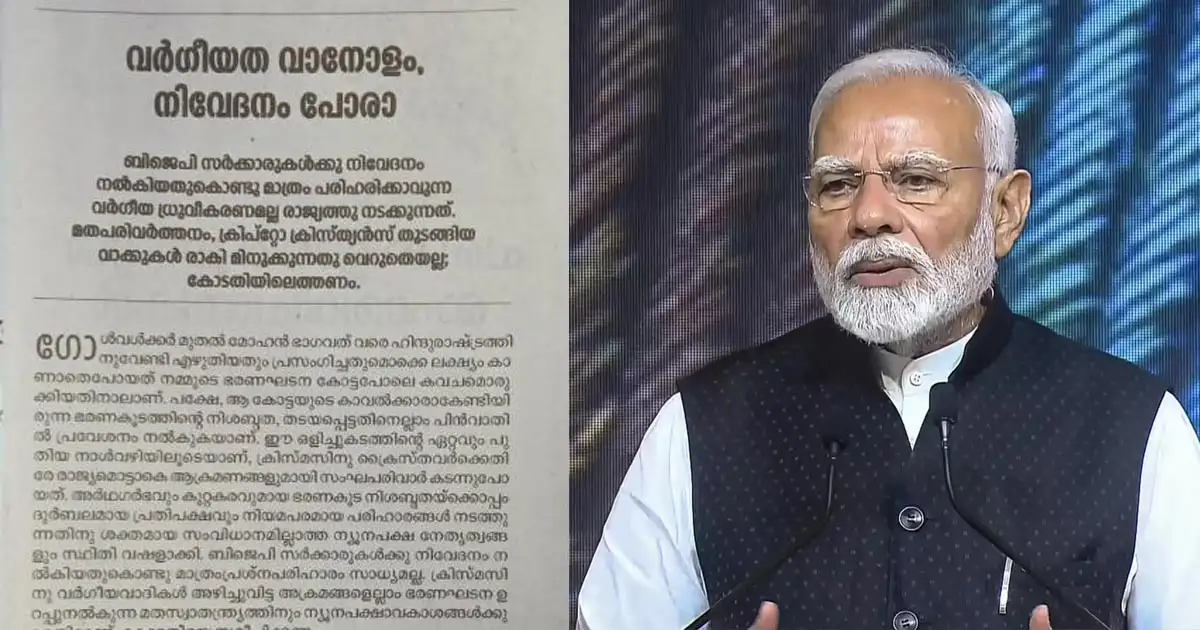 ആ കോട്ടയുടെ കാവൽക്കാർ ആകേണ്ടിയിരുന്ന ഭരണകൂടത്തിന്റെ നിശബ്ദതയാണ് നടക്കുന്നത്. പുറത്ത് ക്രിസ്തുമസ് അലങ്കോലമാക്കുമ്പോൾ പ്രധാനമന്ത്രി പള്ളിക്കുള്ളിൽ പ്രാർത്ഥനയിൽ പങ്കെടുക്കുന്നു. ഇതെല്ലാം രാജ്യത്തെ പൗരന്മാരെ കാണിക്കാൻ അല്ല. മറ്റു രാജ്യങ്ങളെ കാണിക്കാൻ ആണ്. അല്ലെങ്കിൽ ആക്രമണങ്ങളെ അപലപിക്കുകയോ നടപടി സ്വീകരിക്കുകയോ ചെയ്യുമായിരുന്നു. സംഘപരിവാർ ആക്രമണങ്ങളേക്കാൾ ന്യൂനപക്ഷങ്ങളെ ഭയപ്പെടുത്തുന്നത് ഈ നിശബ്ദതയാണെന്നും മുഖപ്രസംഗം വിമർശിക്കുന്നു.