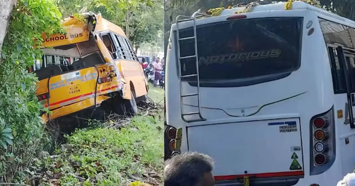 പൊൻകുന്നത്ത് സ്കൂൾ ബസും ശബരിമല തീർഥാടകരുടെ ബസും കൂട്ടിയിടിച്ചു; തീർഥാടകൻ റോഡിലേക്ക് തെറിച്ചുവീണു