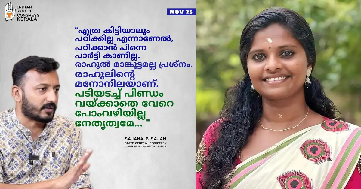 ലൈംഗികാരോപണം നേരിടുന്ന രാഹുല് മാങ്കൂട്ടത്തിലിനെ പാര്ട്ടി പ്രാഥമികാംഗത്വത്തില് നിന്ന് അടിയന്തരമായി പുറത്താക്കണമെന്ന് യൂത്ത് കോണ്ഗ്രസ് സംസ്ഥാന ജനറല് സെക്രട്ടറി സജന ബി സജന്. എത്ര കിട്ടിയാലും പഠിക്കില്ല എന്നാണേല് പഠിക്കാന് പിന്നെ പാര്ട്ടി കാണില്ല. രാഹുല് മാങ്കൂട്ടമല്ല പ്രശ്നം, രാഹുലിന്റെ മനോനിലയാണ്. പടിയടച്ച് പിണ്ഡം വെക്കാതെ വോറെ പോംവഴിയില്ല നേതൃത്വമേ എന്നും സജന ഫേസ്ബുക്കില് പറയുന്നു